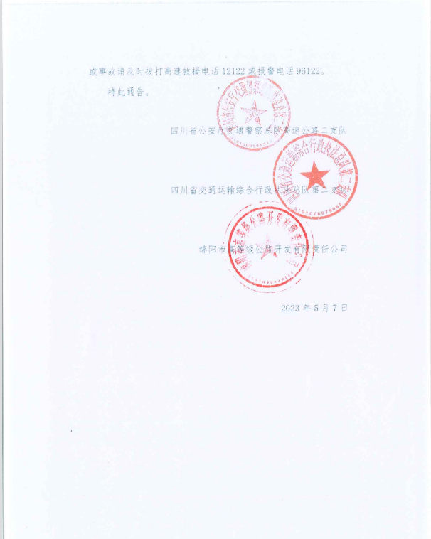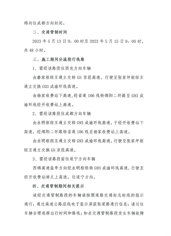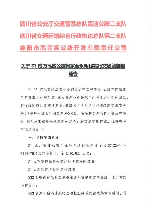 關(guān)于S1成萬(wàn)高速公路楊家至永明段實(shí)行交通管制的通告