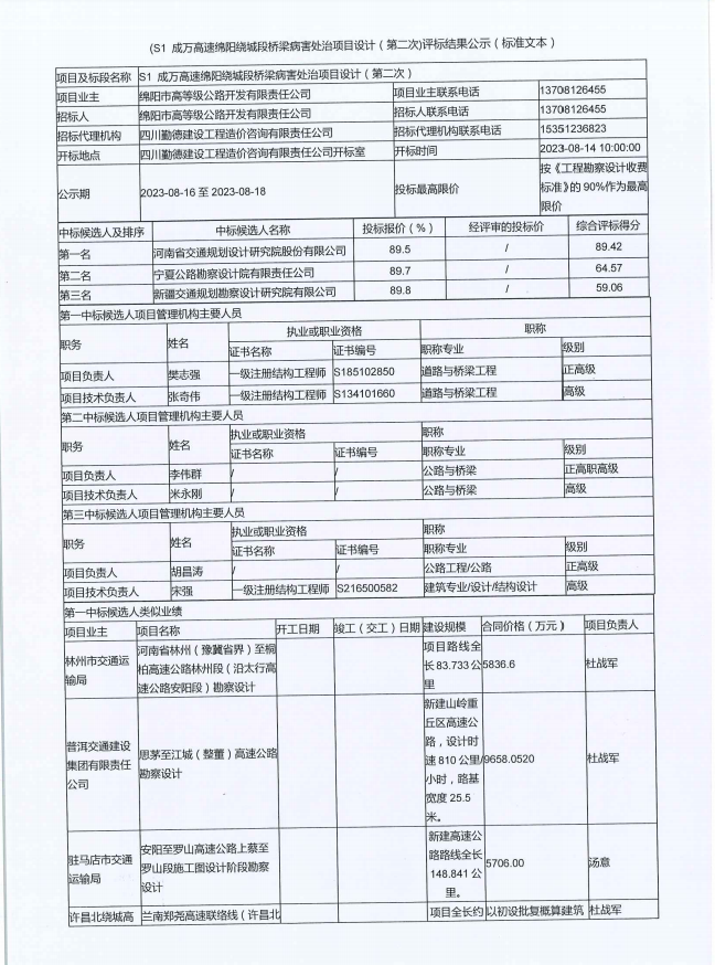 (S1 成萬(wàn)高速綿陽(yáng)繞城段橋梁病害處治項(xiàng)目設(shè)計(jì)(第二次)評(píng)標(biāo)結(jié)果公示(標(biāo)準(zhǔn)文本)